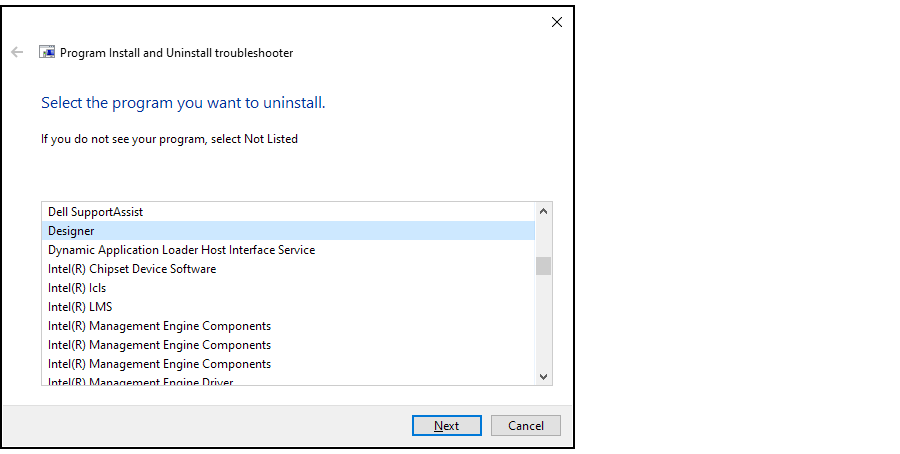 4. Select Designer and click Uninstall but this time choose Repair to repair Designer.