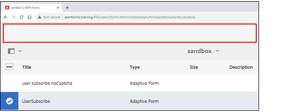 You may see instances where adaptive form features are not working. For example, in this illustration, we see a missing Action bar. When we select an adaptive form, as we have done here, we should see the action bar in the area outlined in red (see illustration).