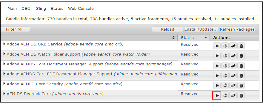 5. When you see AEM Form bundles that are not active, click Start (outlined in red) to move them to an active state.