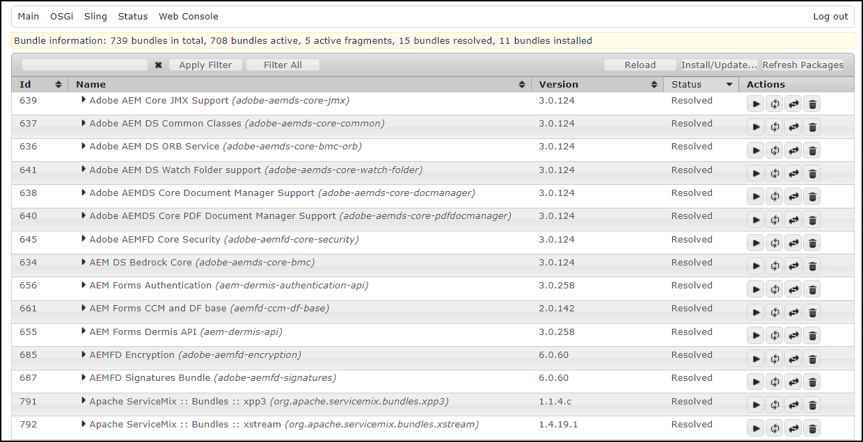 4. Consider the next screenshot. As you can see, there are 15 bundles in a Resolved state and 11 bundles in an Installed state. None of these are Active. You can also see that these are AEM Form bundles. Notice strings like AEMFD and AEM Forms in the names of the bundles that are not active.