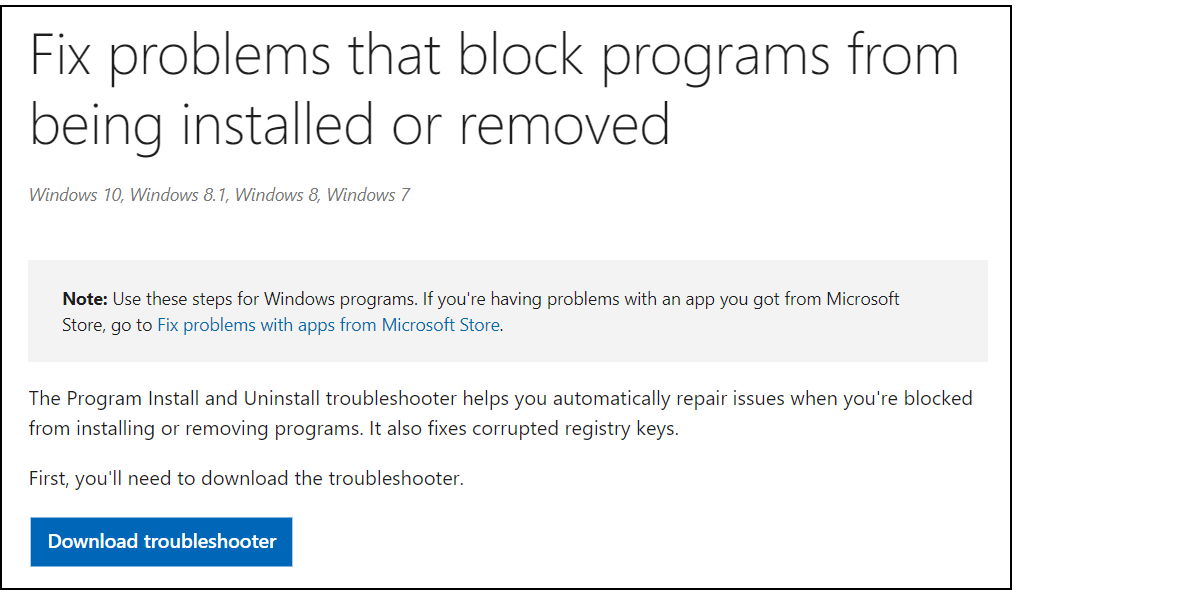 When this is the case, download Microsoft’s Program Install and Uninstall troubleshooter. Google "microsoftprogram_install_and_uninstall" and you will see the current link. Click Download troubleshooter (see illustration).