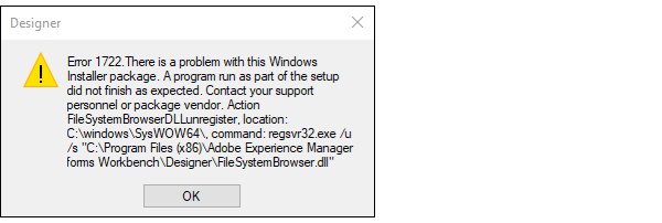 Sometimes Designer or Workbench do not uninstall properly. You may see “Error 1722 There is a problem with this Windows Installer package”. The Error 1722 may include a reference to the FileSystemBrowserDLLunregister (see illustration).